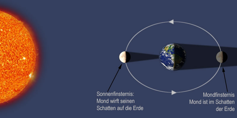Wenn die Umlaufbahn des Mondes und die Umlaufbahn der Erde in einer Ebene lägen, würde es jeden Monat eine Sonnenfinsternis geben. Allerdings ist die Umlaufbahn des Mondes leicht geneigt, so dass Sonnenfinsternisse gar nicht so häufig vorkommen. Manchmal führt die Umlaufbahn des Mondes ihn in den Schatten der Erde. Dann verdunkelt sich der Mond: Es gibt eine Mondfinsternis. (Etwas Sonnenlicht trifft allerdings immer noch auf den Mond, weil es von der Erdatmosphäre gebrochen wird.)