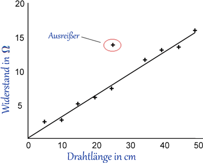 Aufgrund von Unsicherheiten liegen die Messpunkt in einem Diagramm nie gleichmäßig auf einer geraden Linie. Also verbinde die Punkte nicht miteinander! Zeichne stattdessen eine gerade Linie oder eine gleichmäßige Kurve, die den meisten der Messpunkte am nächsten liegt. Diese nennt man Ideallinie. Bevor du sie einzeichnest: